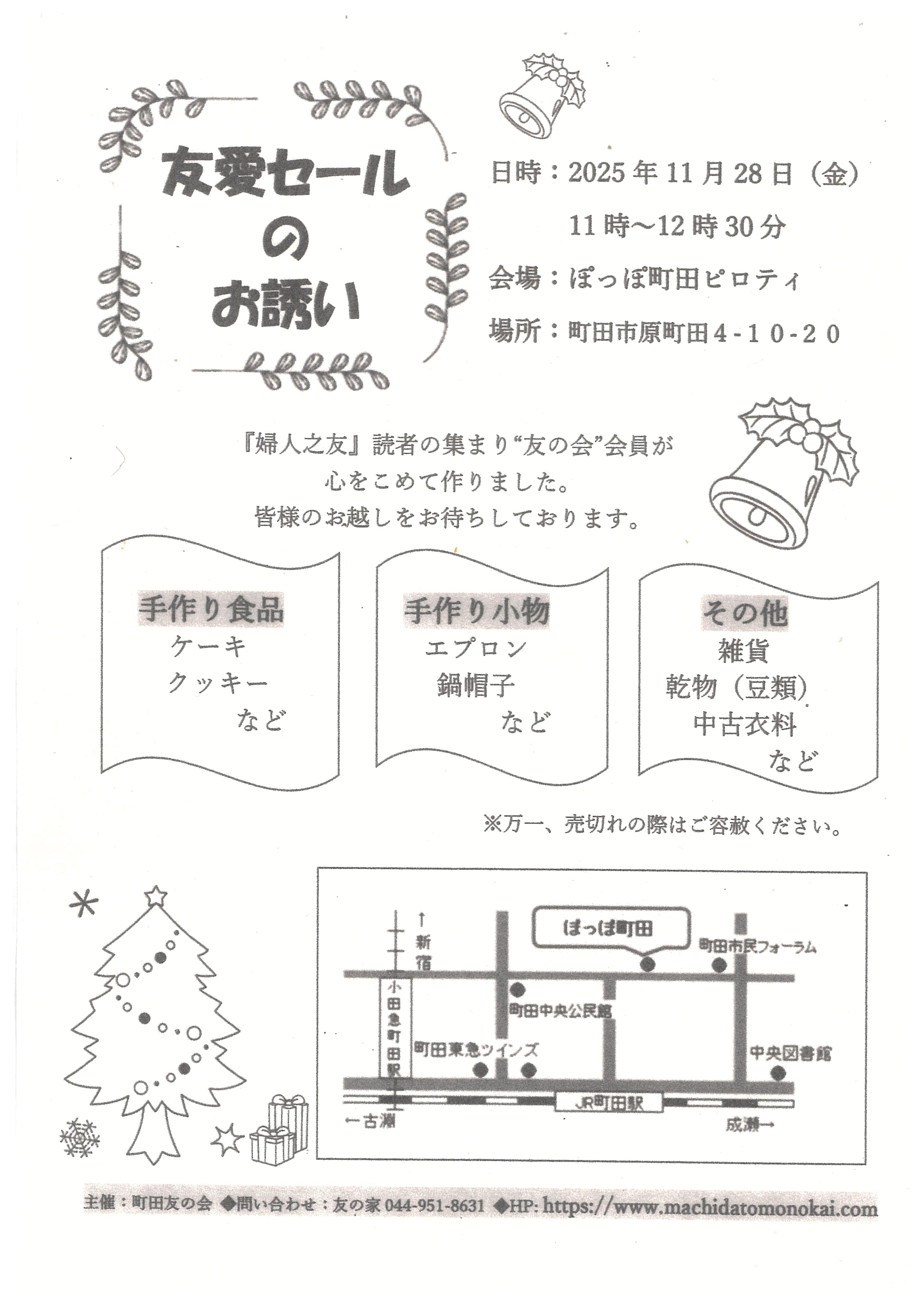 開催日:2025年11月28日(金) 創刊122年の雑誌「婦人之友」読者の集まりです。 お問合せ先 町田友の会 |