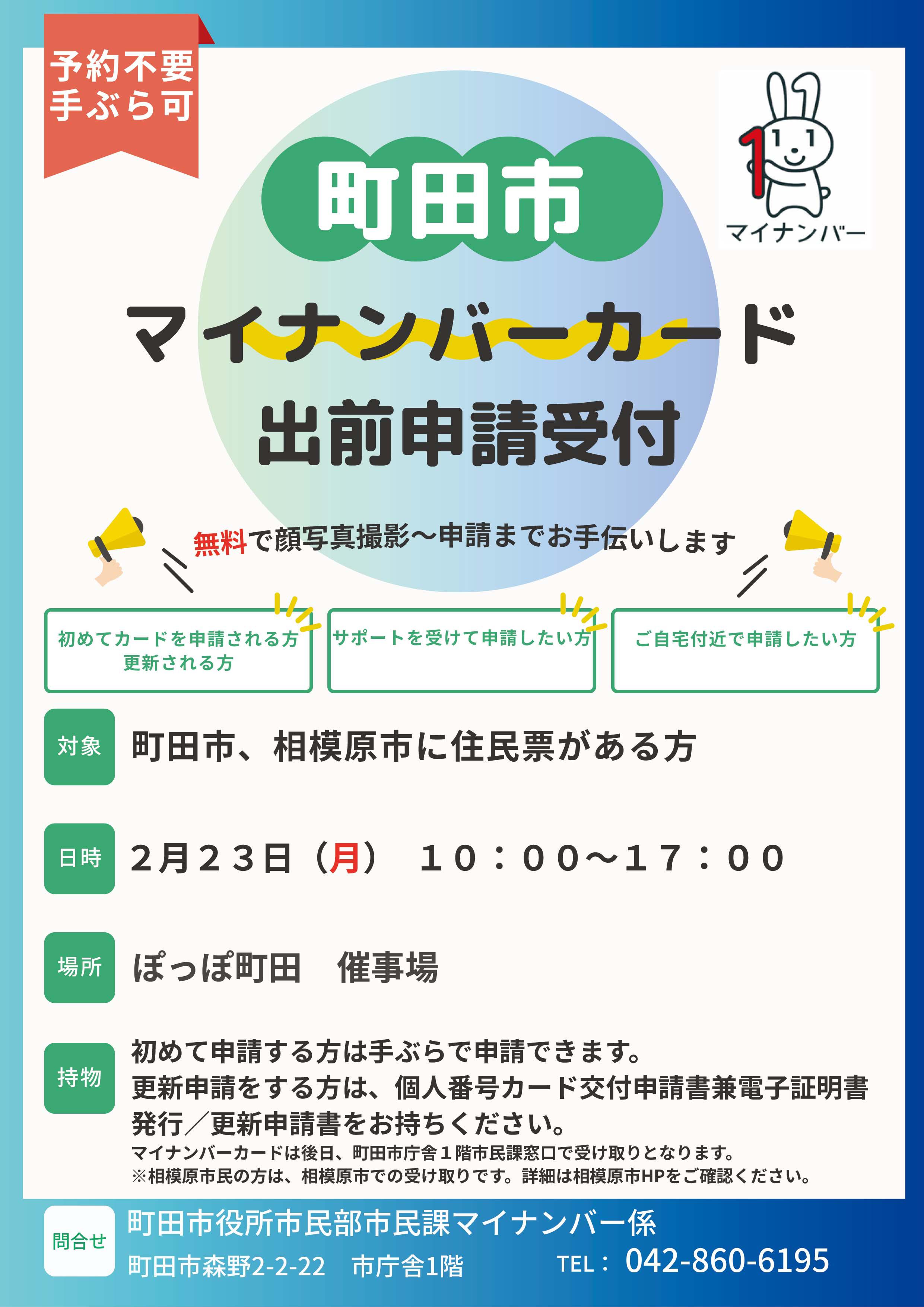 開催日:2026年2月23日(祝・月) 町田市マイナンバーカード出前申請受付 お問合せ先 町田市役所 市民課 マイナンバー係 |