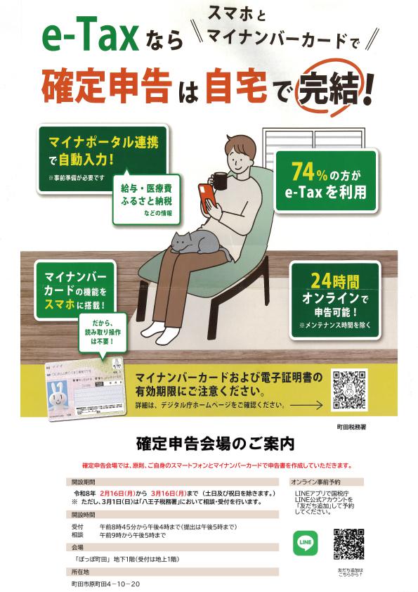 下記の期間、ぽっぽ町田は、「町田税務署 令和7年分確定申告会場」になります。 詳細は、「コチラ」をご参照ください。 ◆受付時間:午前8時45分から午後4時(注1〜3) ※備え付けてある確定申告用紙については、お1人様1部に限り、必要な書類をお持ち帰りいただいても差し支えありません(備え付けのない用紙については、国税庁ホームページからダウンロードできます。)。 ※来年以降、ぽっぽ町田では確定申告用紙の配付は実施しません。確定申告に必要な書類等は、国税庁ホームページからダウンロードをお願いします。 ◆来場される方へのお願い 〇確定申告の用紙は、国税庁ホームページからダウンロードできます。 |