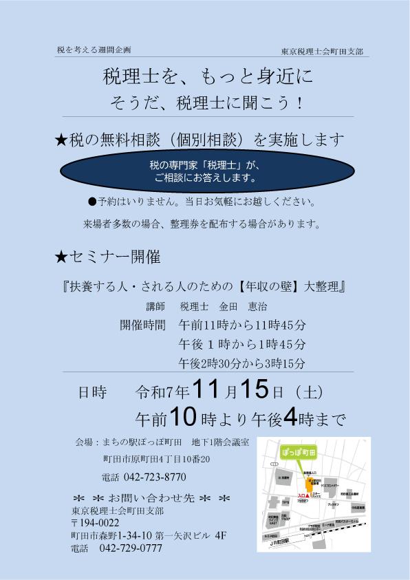 開催日:2025年11月15日(土) 11月11日(火)から17日(月)まで、国税庁の主催による「税を考える週間」が実施されます。 ※来場者多数の場合、整理券を配布する場合があります。 お問合せ先 東京税理士会町田支部 TEL 042-729-0777 |
