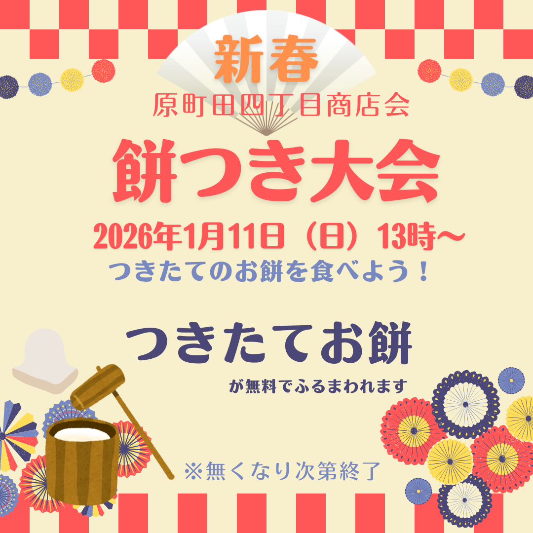 開催日:2026年1月11日(日) 新春恒例の四丁目商店会による餅つき大会です。 お問合せ先 原町田四丁目商店会 |