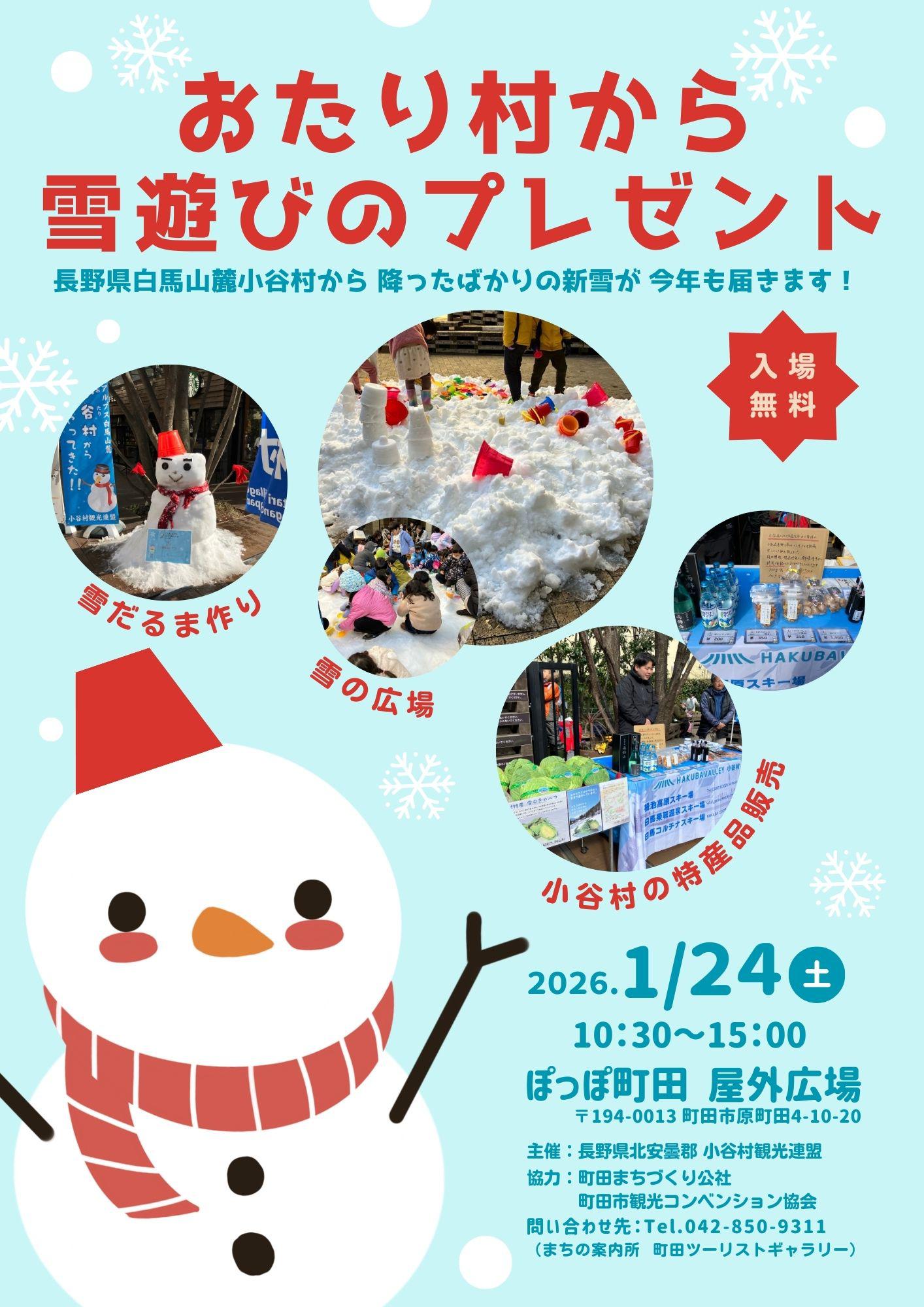 開催日:2026年1月24日(土) 小谷村から雪のプレゼント!雪あそび広場と雪だるまが登場! また、この時期限定の「雪中キャベツ」や「雪どけサイダー」など、小谷村の特産品の販売も実施します。 お問合せ先 一般社団法人 小谷村観光連盟 |