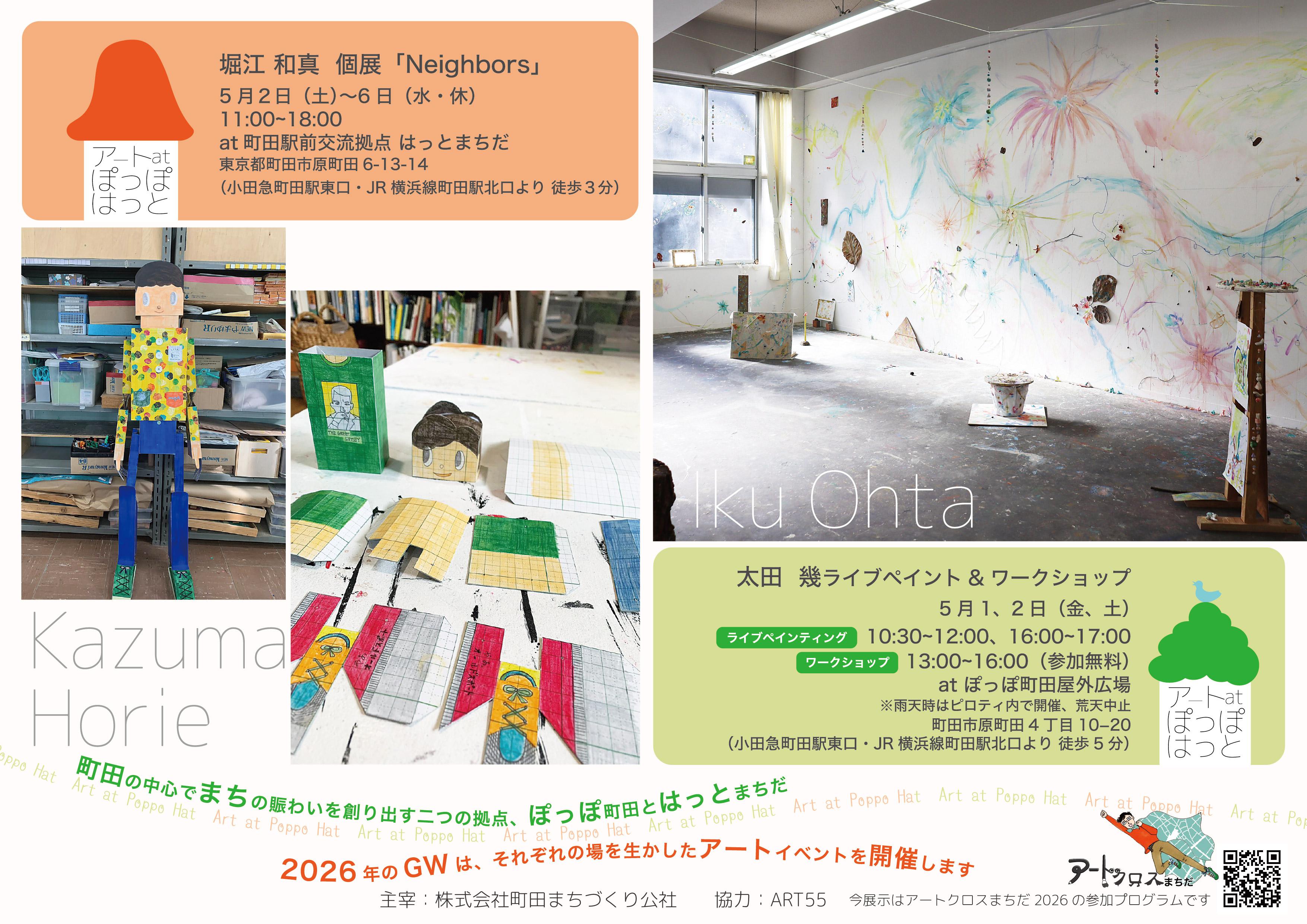 開催日:2026年5月1日(金)・2日(土) 町田の中心でまちの賑わいを創り出す二つの拠点、ぽっぽ町田とはっとまちだにて、それぞれの場を生かしたアートイベントを開催します。 ぽっぽ町田では「色と線と形、大きな長い布に自由に描いてみよう」をテーマに、太田さんが描いた作品に絵具やクレヨンで好きな形、好きなものを自由に描いて頂けるワークショップを開催!(☆参加無料・予約不要) ライブペイントを通して、描くよろこびを感じながら、その場で作品が生まれる瞬間を楽しんでみませんか。ぜひお気軽にご参加下さい。 ☆汚れても良いお洋服でご参加下さい。 お問合せ先 (株)町田まちづくり公社 |
